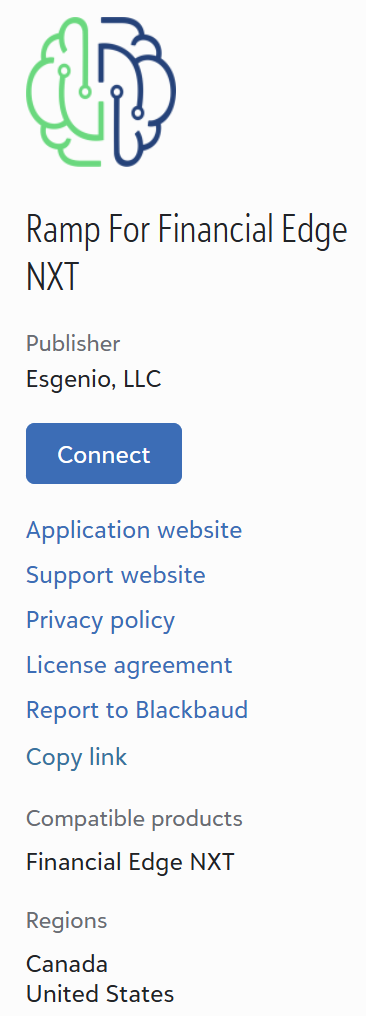 Ramp for FE is listed within the Blackbaud Market place, from here you can review and authorize its access. By clicking the connect button and follow the instructions.