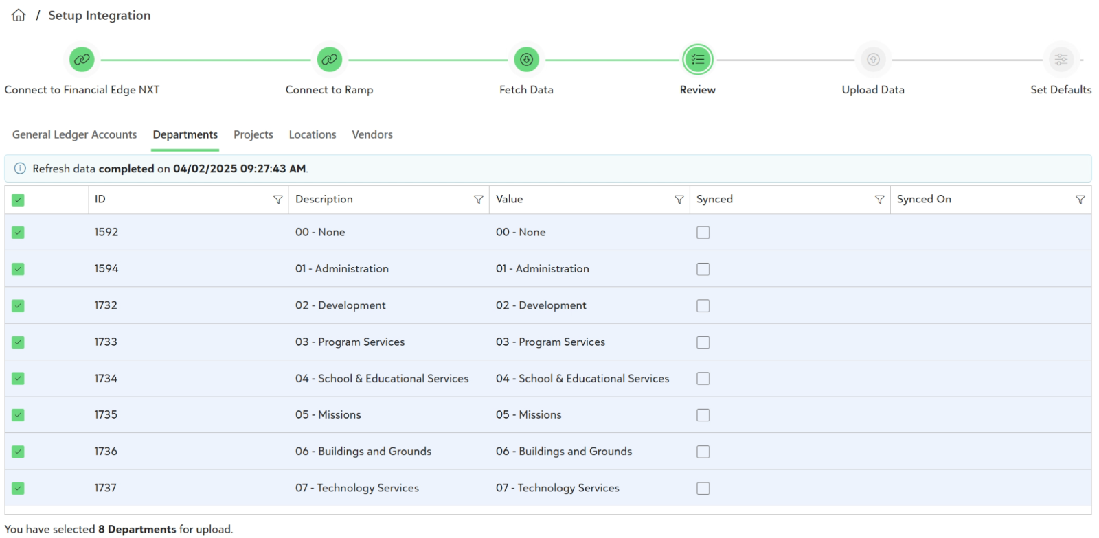 Upload your general ledger (GL) accounts, projects, vendors, departments, and locations from FENXT into Ramp.