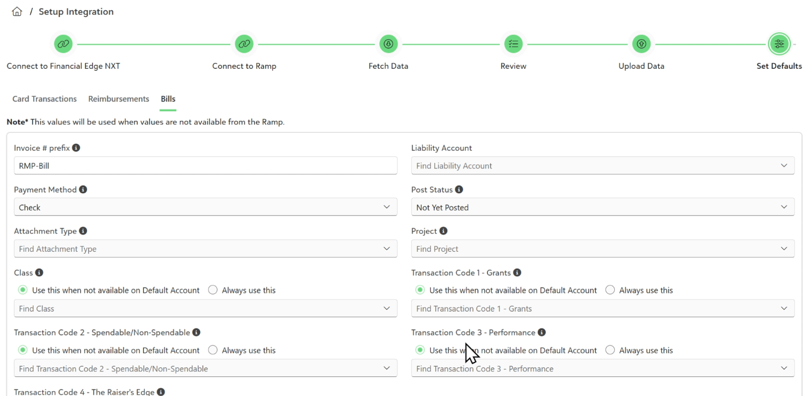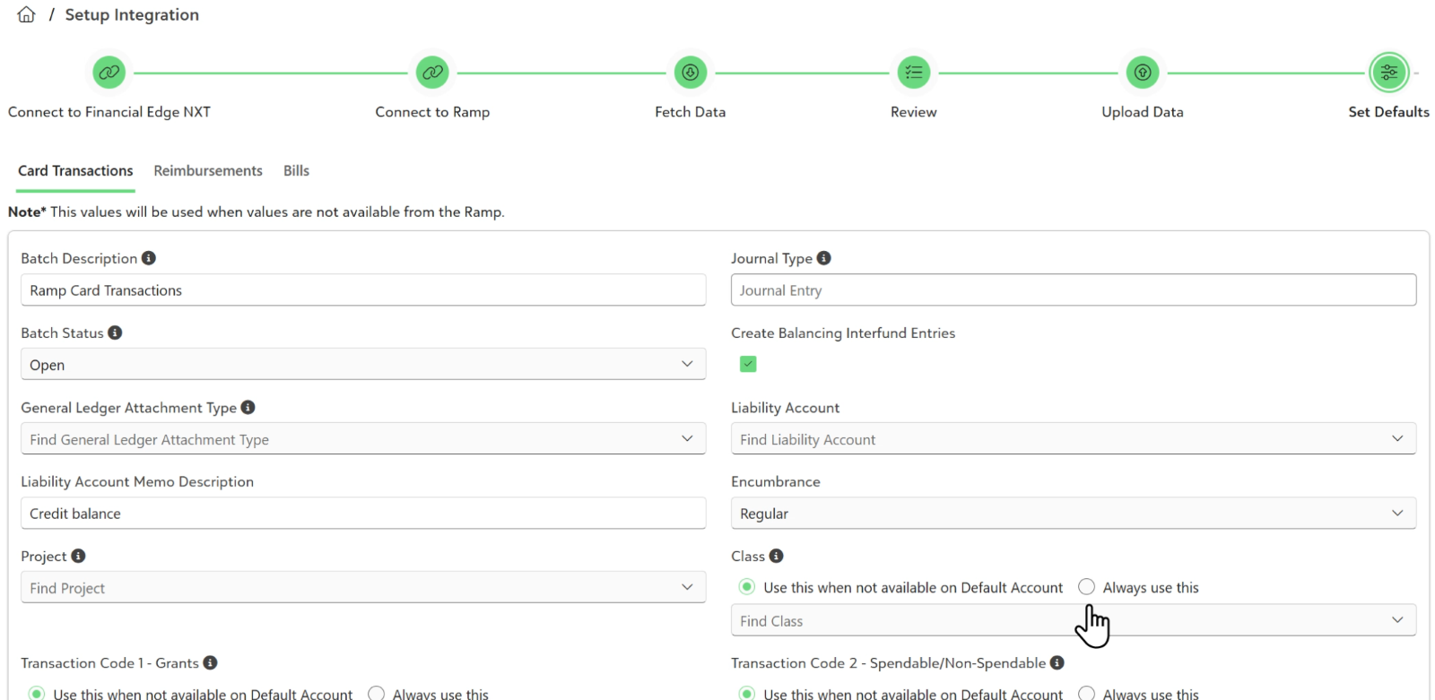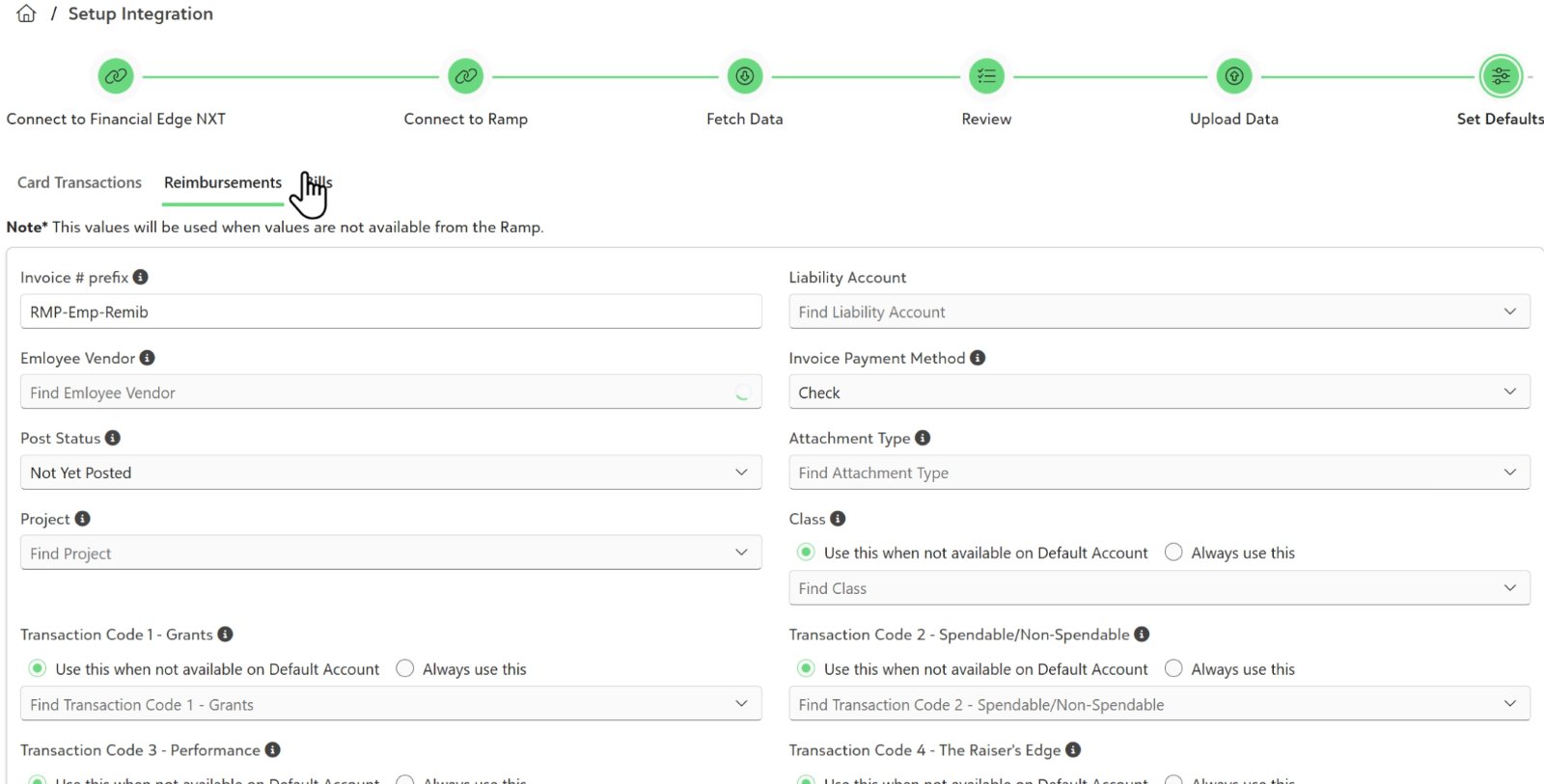 Enable you to set default mappings for transactions created in FENXT from Ramp.