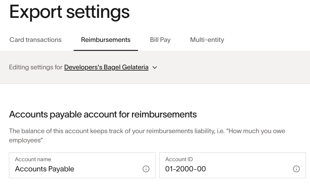 The reimbursements payables account is used from Ramp’s Export settings by default. The Account ID and Account Name should match the full account number and Name from FENXT. If you are using multiple entities in Ramp, make sure to set these values for each entity.