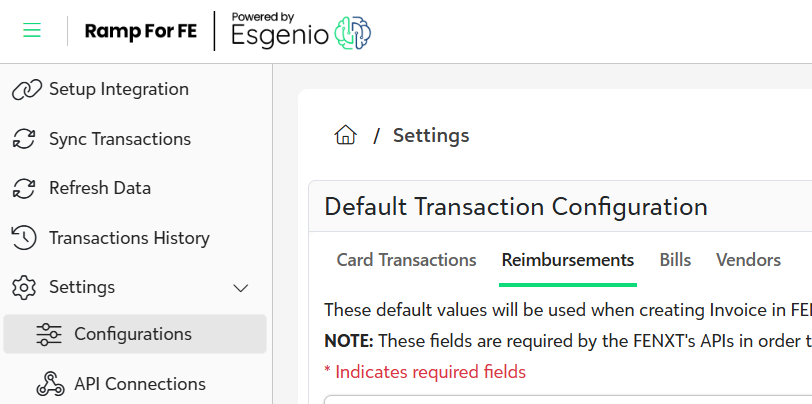 The Default Transaction Configuration for Reimbursements defines how reimbursements from Ramp will be created in FENXT. These default values ensure all transactions meet the required fields in FENXT's APIs and help streamline transaction processing.