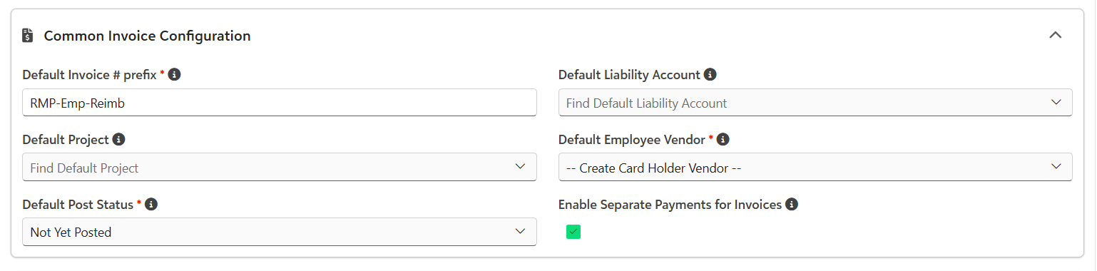 - Default Employee Vendor - Determines whether or not to create a card holder vendor (if the employee does not exist) or to use a different vendor.