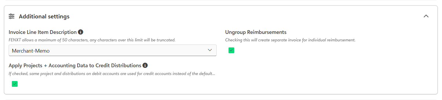 - Invoice Line Item Description - Select how the line item description should be formatted on the invoice. You can include combinations of Employee Name - Merchant - Memo, Merchant - Memo, Employee - Memo, or just Memo